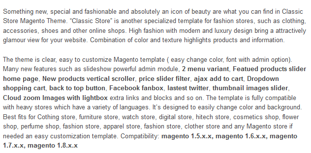 - Template is fully compatible with magento verion: 1.5.x.x, 1.6.x.x, 1.7++