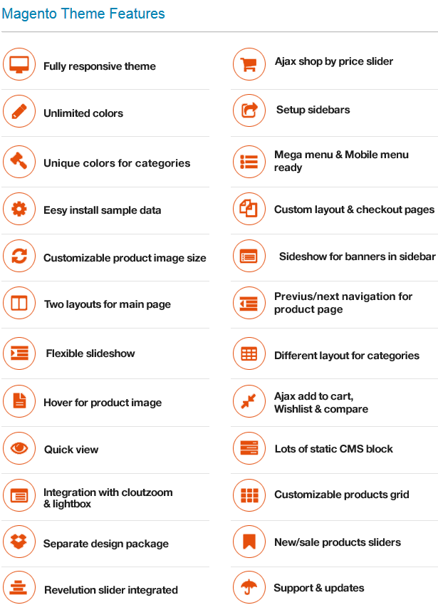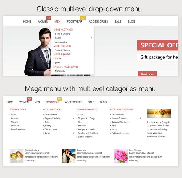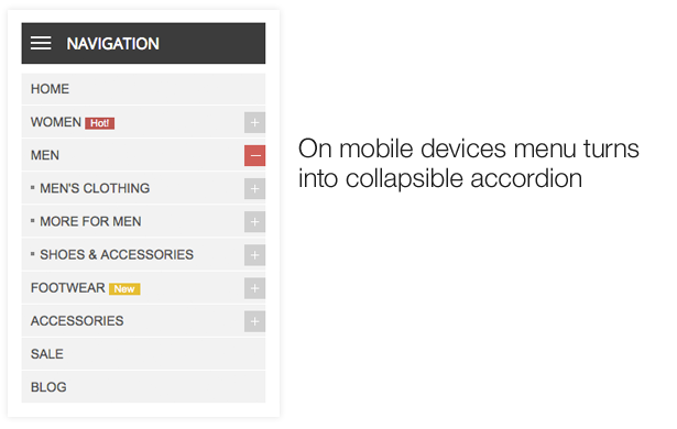 - Smart menus supported: allow you to show the categories as a drop down menus or accordion menus on the sidebar