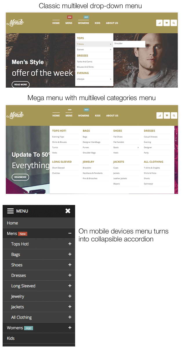 - Smart menus supported: allow you to show the categories as a drop down menus or accordion menus on the sidebar