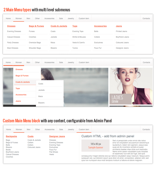 - Custom top menu blocks feature – make your own menu blocks with any HTML inside