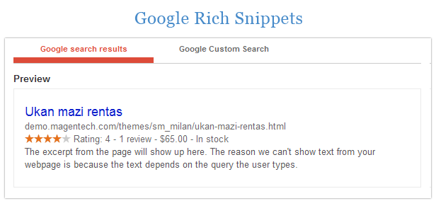 Allows you to control appearance of your product such as product name, image, reviews and other useful information in organic Google search results, increasing click through rates and improve quality traffic to your store.