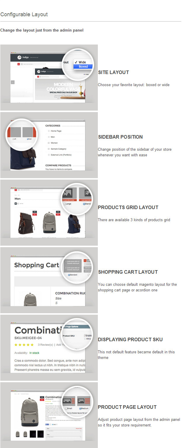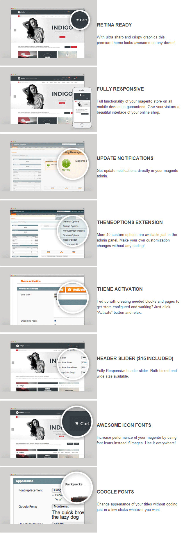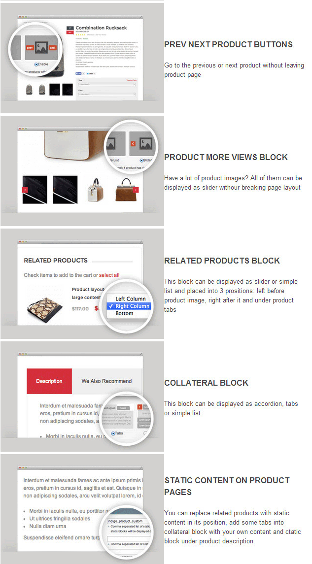 Custom widgets: New Products, Featured Category products, Tabs, Social Links. |