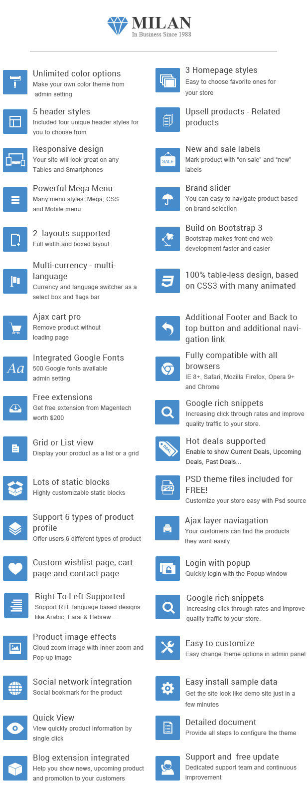 The multi-purpose Magento theme is built with new web technology: Bootstrap 3, Font Awesome 4, LESS, CSS3, HTML5 that makes the theme more powerful and flexible.
