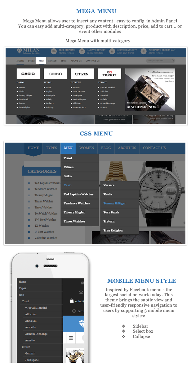 With our mega menu, you can create menu with up to 6 columns to display categories and products with description, price, image, video, effects… or even add links to any page, static blocks with promotion banners and modules.