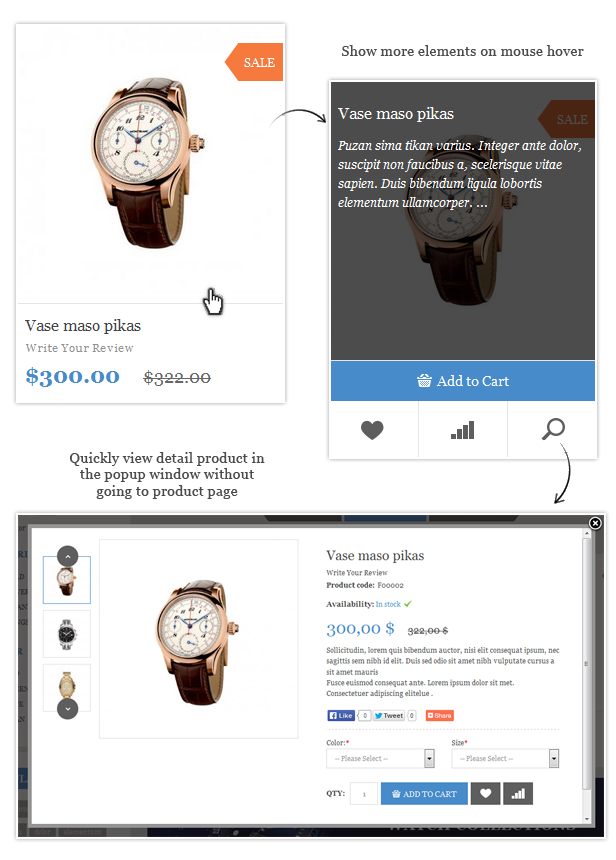 It’s so convenient for customers to view quickly detail product on the Homepage, Listing page without leaving the current page. Your product detail will open with full necessary information like: image product, product price, description, product reviews, product attributes and link to the product detail page, etc. You can turn on/off “Quick View” option easily in the Admin Panel.
