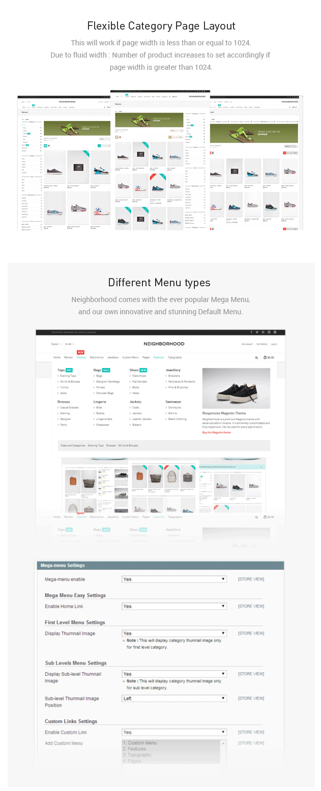 - Custom Blocks : Ability to set your custom contents and banners using custom blocks in drop down menu. Also able to set your custom page link