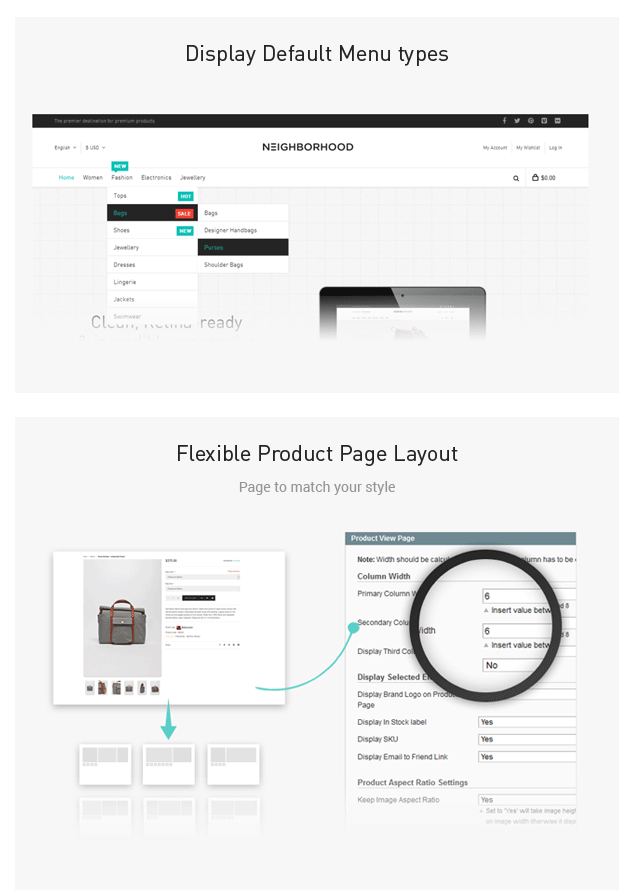 - Product Display Options : Able to define 1 column, 2 Column & 3 Column layout
