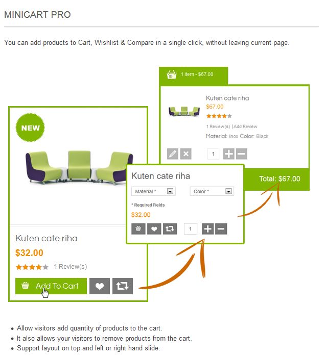 - Support Responsive Slideshow, Ajax Cart Pro for quick buy